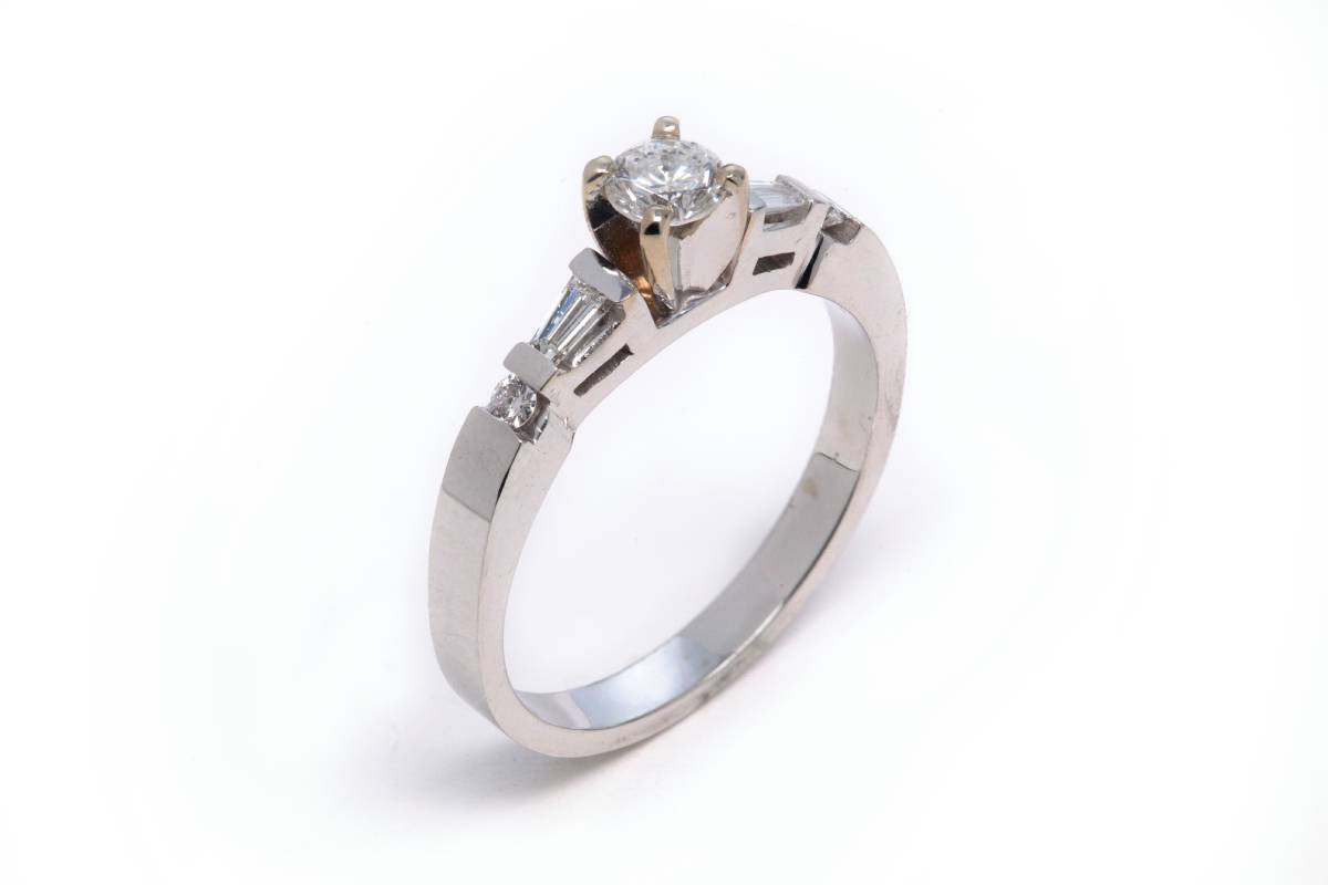 One ladies custom made 14kt white gold engagement ring. The center stone is a round brilliant cut natural white diamond gauging 4.0 X 3.96mm, carat weight 0.26ct, clarity SI2, colour F and cut Good. Two baguette cut tapered natural white diamonds gauging 3.3 X 1.75mm, total carat weight 0.13ct.tw., clarity VS, colour H, cut Med. – Good. Two brilliant round cut natural white diamonds gauging 1.8 X 1.8mm, total carat weight 0.05ct.tw. The total diamond weight of the ring is 0.44ct.tw. and total weight of the ring is 3.20 grams.